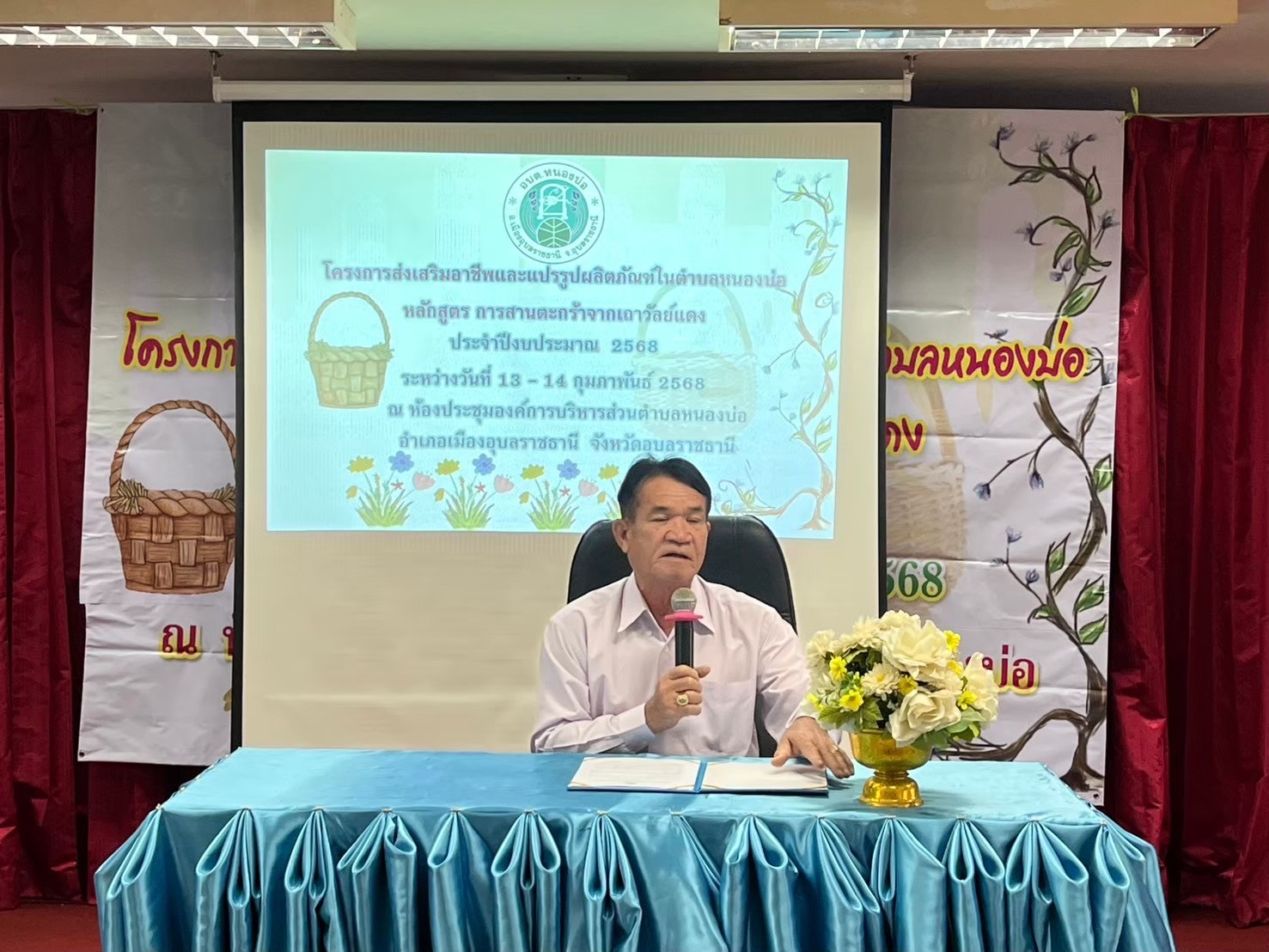 นายพินิจ ส่งเสริม นายกองค์การบริหารส่วนตำบลหนองบ่อ และคณะผู้บริหาร และหัวหน้าส่วนราชการเข้าร่วมโครงการส่งเสริมอาชีพและการแปรรูปผลิตภัณฑ์ให้กับกลุ่มอาชีพในตำบลหนองบ่อ หลักสูตรการสารตะกร้าจากเถาวัลย์แดงประจำปีงบประมาณ 2568