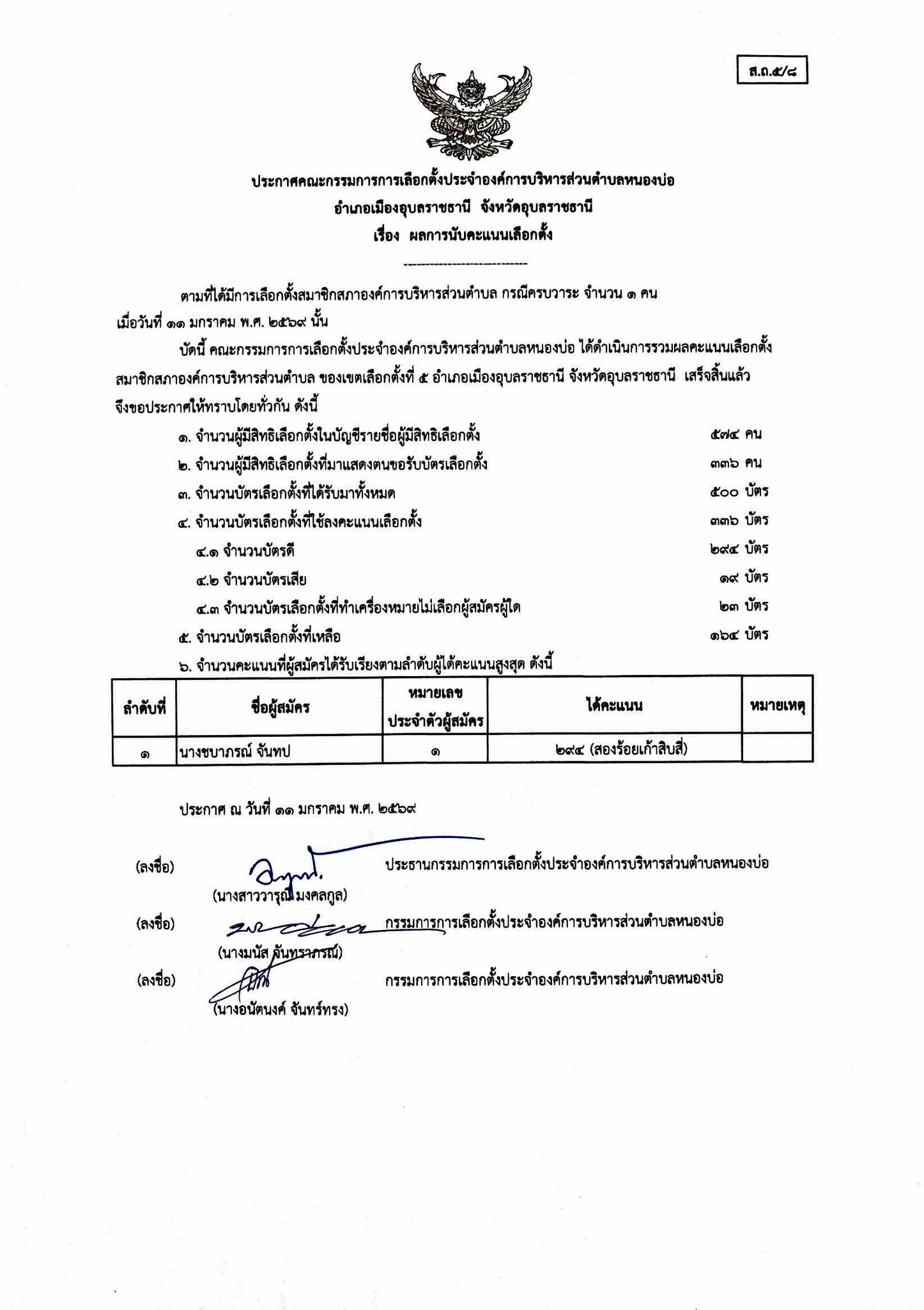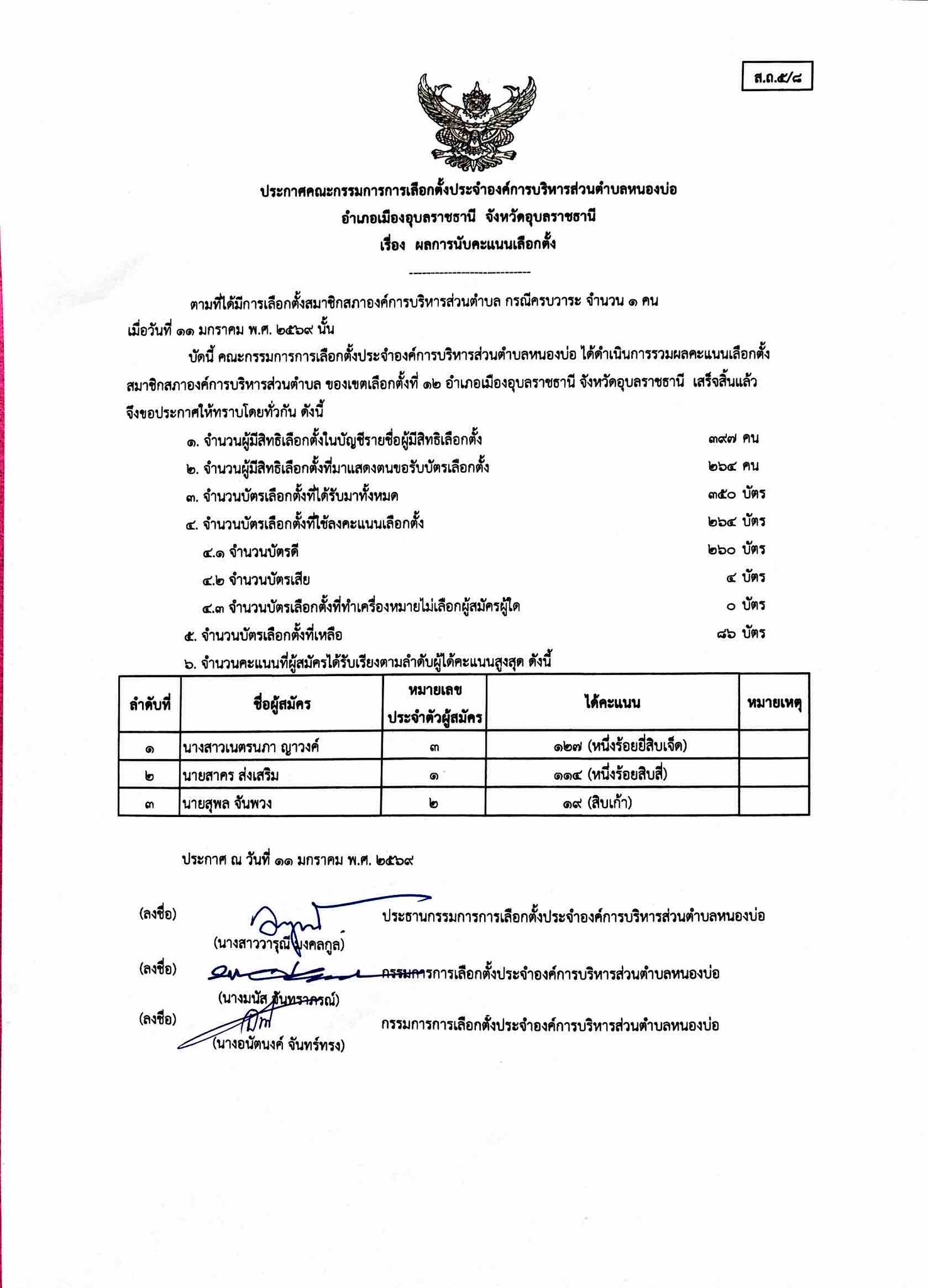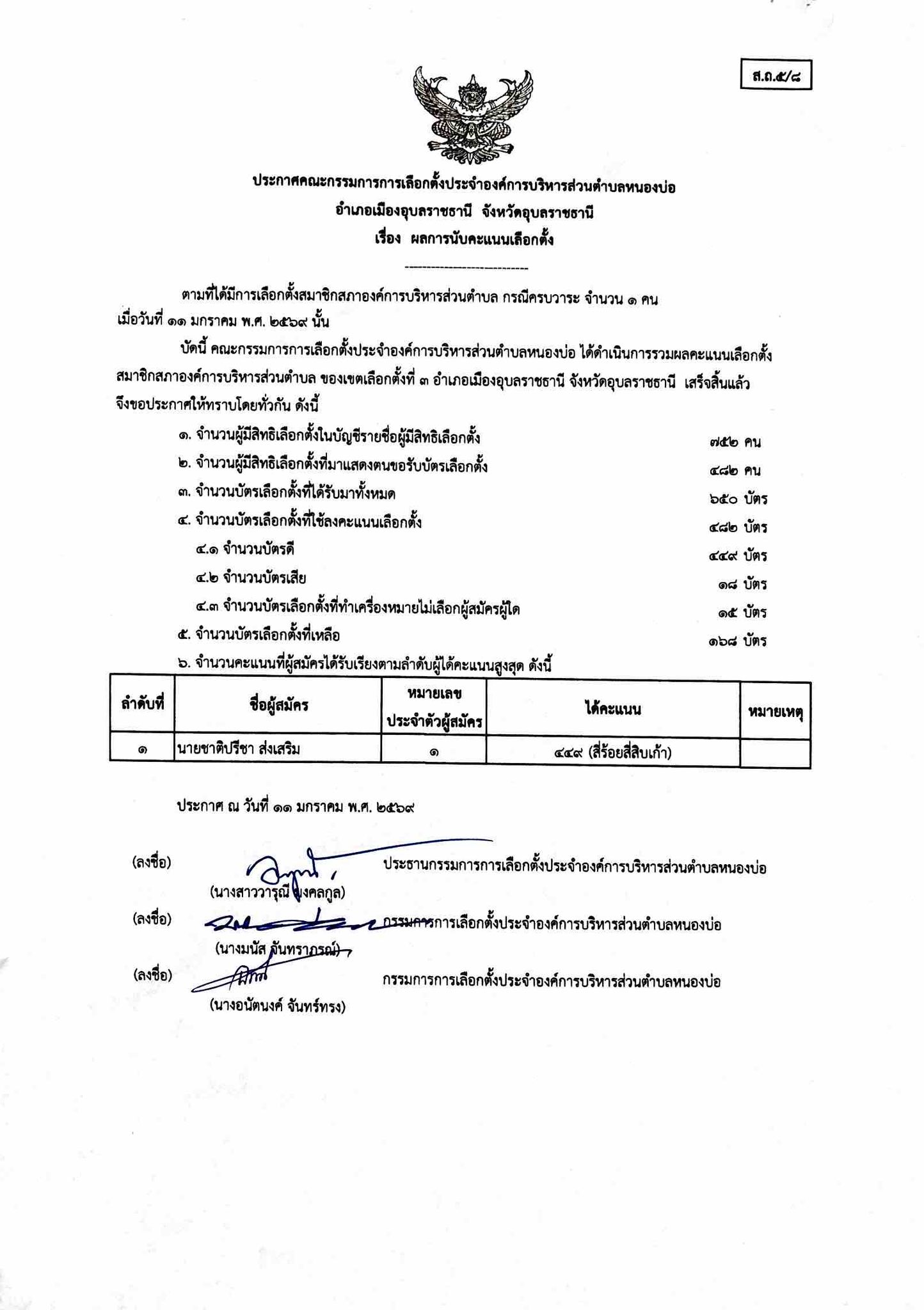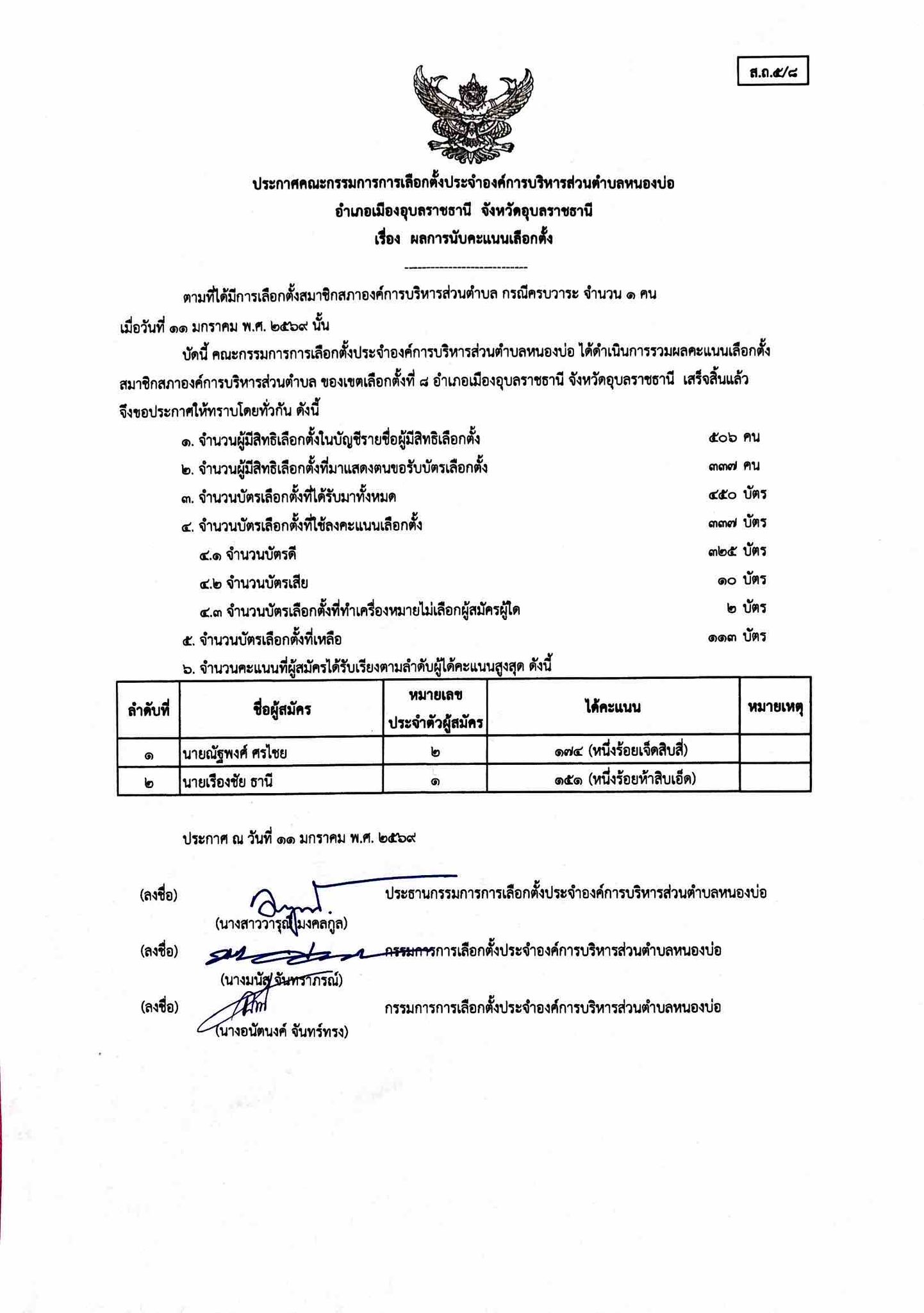 ประกาศคณะกรรมการการเลือกตั้งประจำองค์การบริหารส่วนตำบลหนองบ่อ เรื่อง ผลการนับคะแนนเลือกตั้ง